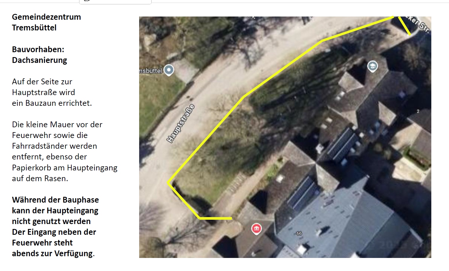 Mit der Aufstellung des Gerüsts wird der Haupteingang des GMZ nicht mehr nutzbar sein. Nur als Fluchtweg von innen bleibt die Tür frei. Alle, die ins 1. OG gelangen müssen, können die Tür neben der Feuerwehr nutzen.
