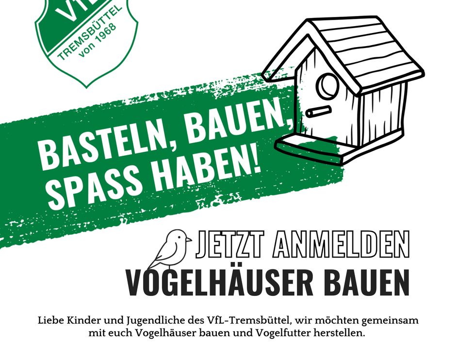 Am 3. Januar 2025 lädt der VfL Tremsbüttel Kinder und Jugendliche (gemeinsam mit ihren Eltern) zu einer besonderen Mitmach-Aktion ein. Von 11:00 bis 14:00 Uhr wird in der Turnhalle gehämmert, gebastelt und gemischt: Wir bauen Vogelhäuser und stellen Vogelfutter her.