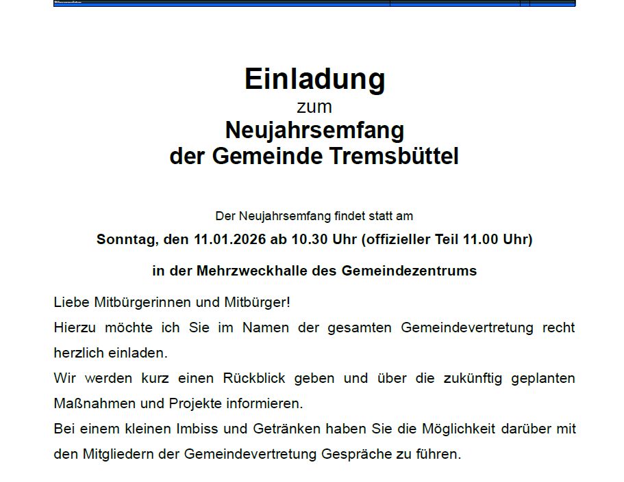 Der Neujahrsempfang wird traditionell im Wechsel von unserem Sportverein und der Gemeindevertretung durchgeführt. Der diesjährige Empfang obliegt der Gemeindevertretung. Hier die Einladung des Bürgermeisters: